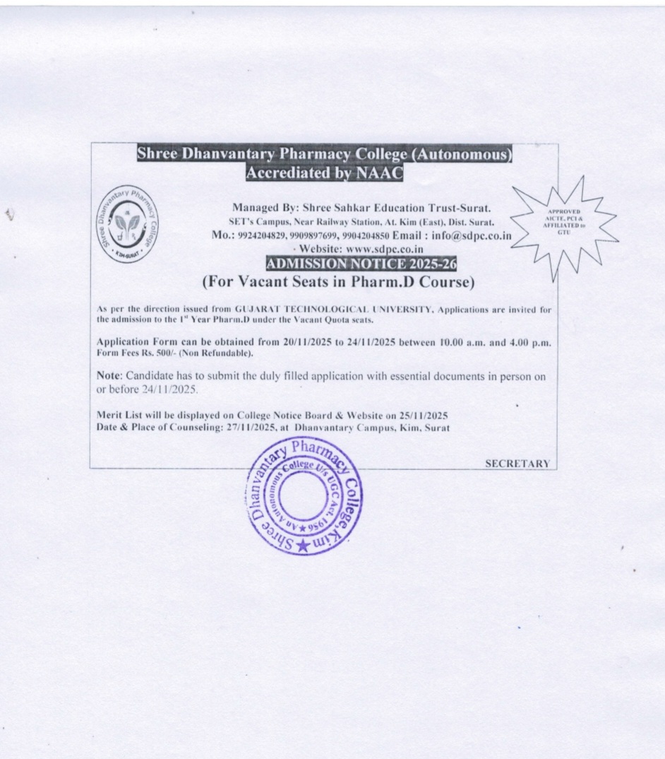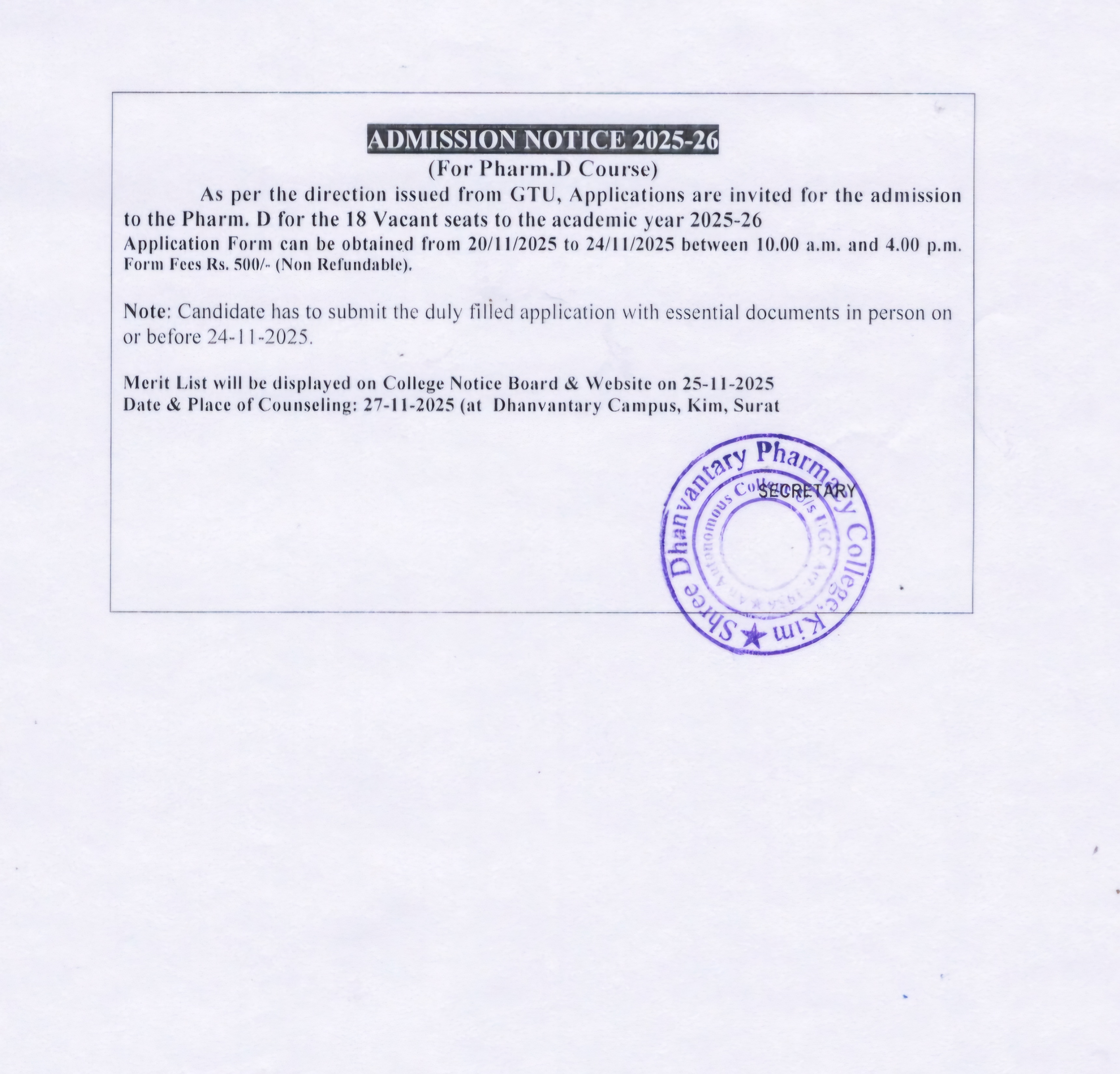 Advertisement for Admission in Vacant Quota of Pharm D.